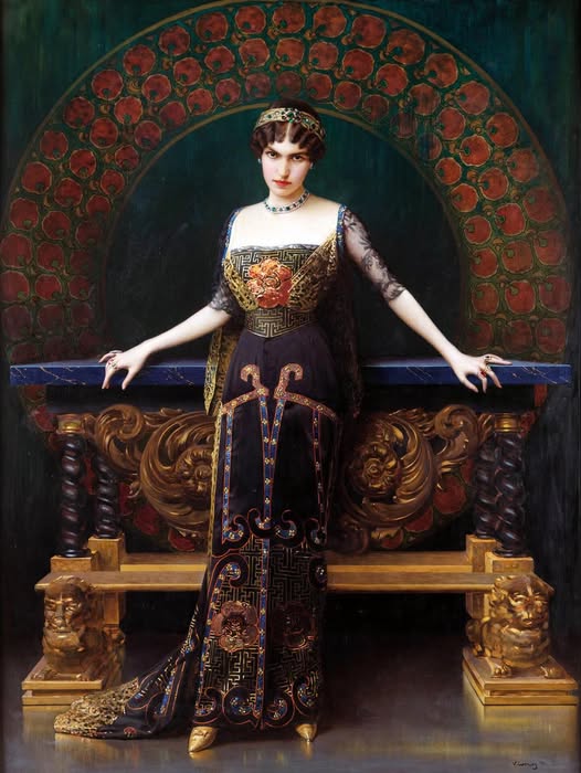 Il ritratto della Marchesa Edith Oliver Dusmet è impeccabile. Abito, gioielli, posa: tutto al posto giusto. Vedo un mondo ricco, ma fragile. Trovo una serie di rimandi visivi: un certo gusto quasi cinematografico nella posa da diva, un’eco delle figure di Alfons Mucha, suggestioni che ricordano i mosaici bizantini, un non so che di orientaleggiante soprattutto nei colori e nella resa dei materiali.
