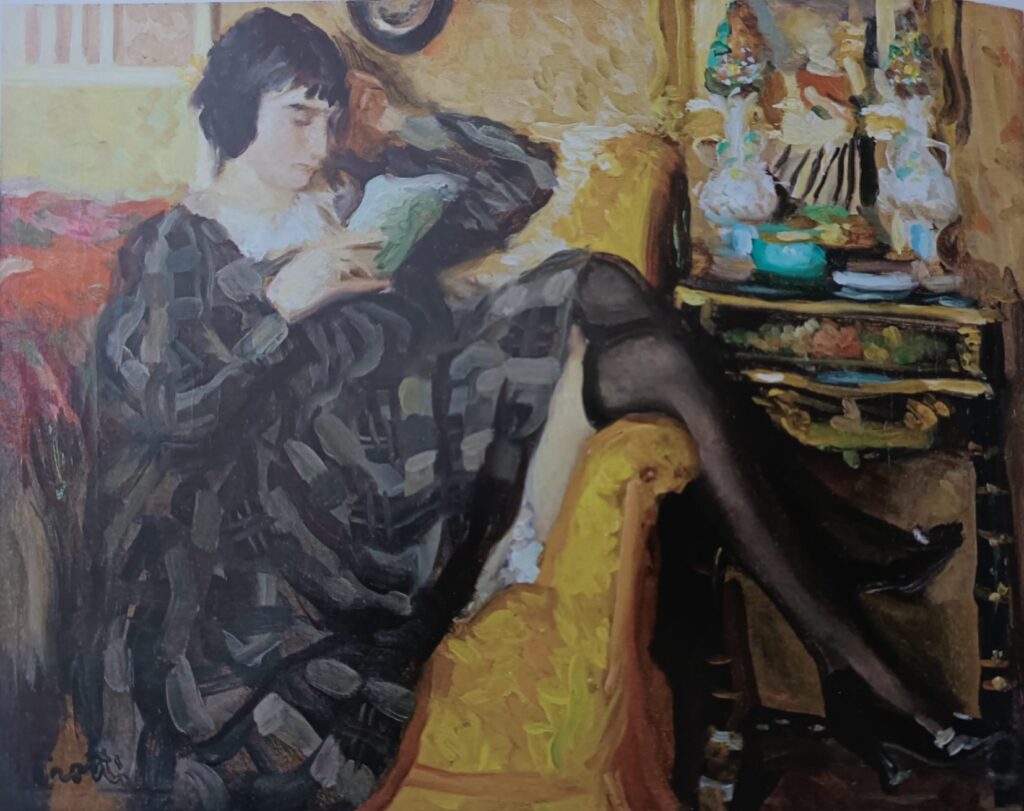 È Alfredo Protti, con la sua La lettura, a darmi lo spunto per pensare a una donna diversa, moderna ed anticonformista. Un quadro che sembra tranquillo. Una donna, un libro, i tacchi. Fine.