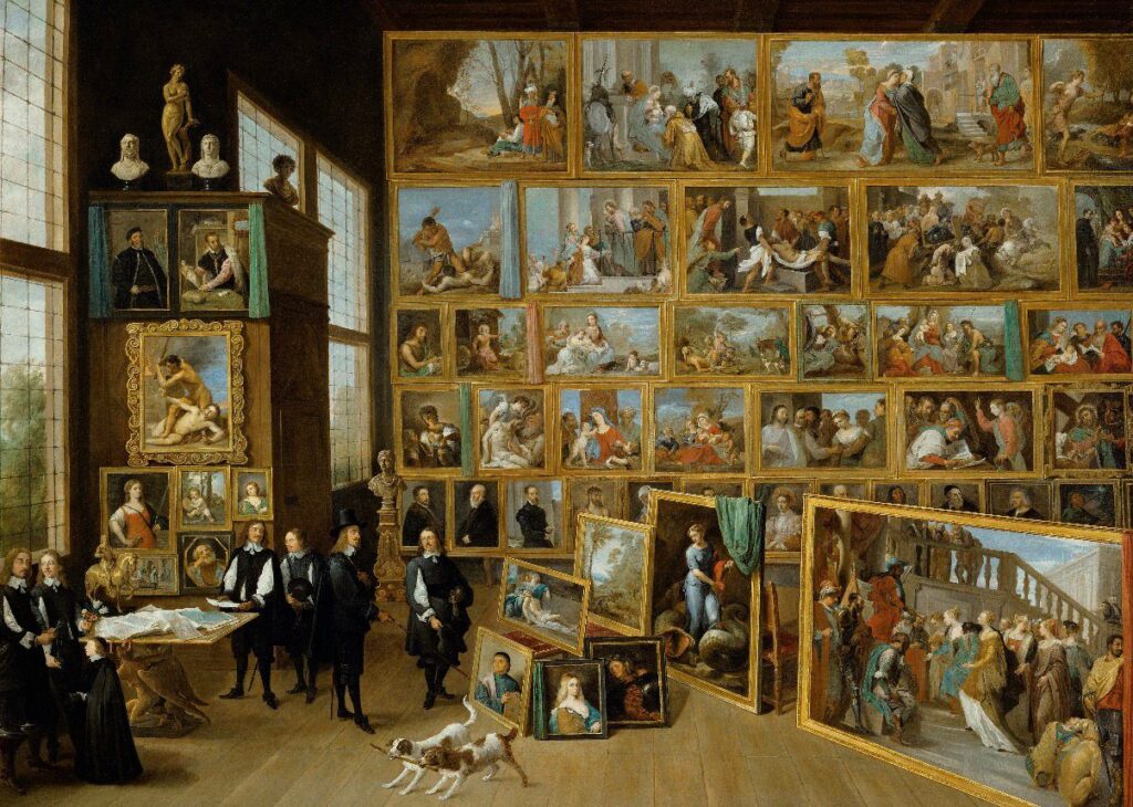 Un’immagine riassume perfettamente questo momento. Nel dipinto Archduke Leopold Wilhelm in His Gallery at Brussels, David Teniers il Giovane raffigura l’arciduca circondato da cortigiani davanti a decine di dipinti italiani appesi alle pareti. L’opera sembra quasi un catalogo visivo della collezione, ma è soprattutto una dichiarazione di potere: possedere l’arte significa anche rivendicare il diritto di ordinarla, mostrarla e trasformarla in autorità culturale.