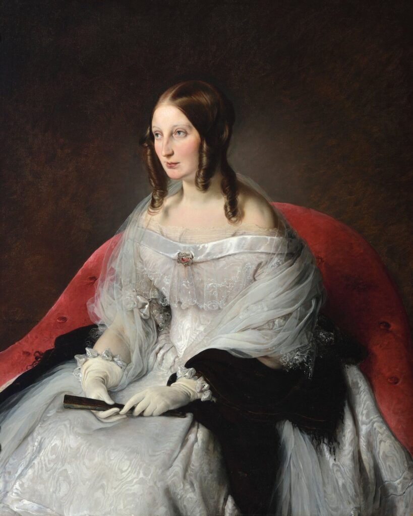 Si tratta di Sarah Luisa Stracham, nome inglese ma nata a Genova, sposata al nobile Vincenzo Ruffo nel 1839. Quando Hayez la ritrae aveva solo 22 anni. Ritratto bellissimo, di grande impatto eh, ma tanto felice non deve essere stata questa principessa. Dama della regina Maria Teresa d’Asburgo Teschen (seconda moglie di Ferdinando II, già molto malinconica di suo, ndr), chissà che allegria a corte. Perdonate il commento dissacratorio.